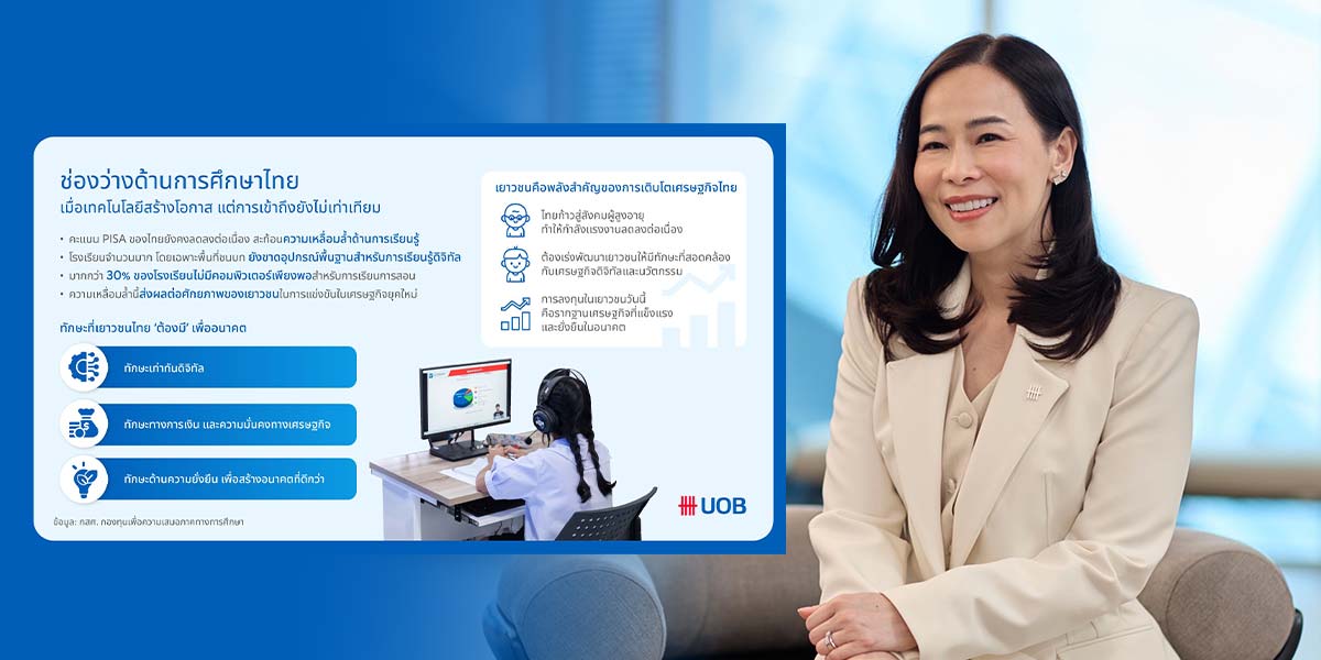 นางสาวธรรัตน โอฬารหาญกิจ ผู้ช่วยกรรมการผู้จัดการใหญ่ บริหารสื่อสารและภาพลักษณ์องค์กร ธนาคารยูโอบี ประเทศไทย หรือ UOB เปิดเผยว่า แม้อัตราการเข้าเรียนของเด็กไทยอยู่ในระดับสูง แต่ผลการประเมิน PISA ล่าสุดสะท้อนว่า นักเรียนไทยมากกว่าครึ่งยังมีผลสัมฤทธิ์ทางคณิตศาสตร์ต่ำกว่าระดับมาตรฐานขั้นต่ำ และผลลัพธ์มีความเชื่อมโยงกับฐานะทางเศรษฐกิจและสังคมของครอบครัวอย่างชัดเจน ขณะเดียวกัน ผลสำรวจของธนาคารแห่งประเทศไทยพบว่า คะแนนความรู้ทางการเงินของคนไทยเฉลี่ยอยู่ที่ประมาณร้อยละ 71 โดยกลุ่มเยาวชนมีระดับความรู้และพฤติกรรมการวางแผนการเงินต่ำกว่าค่าเฉลี่ยของประเทศ