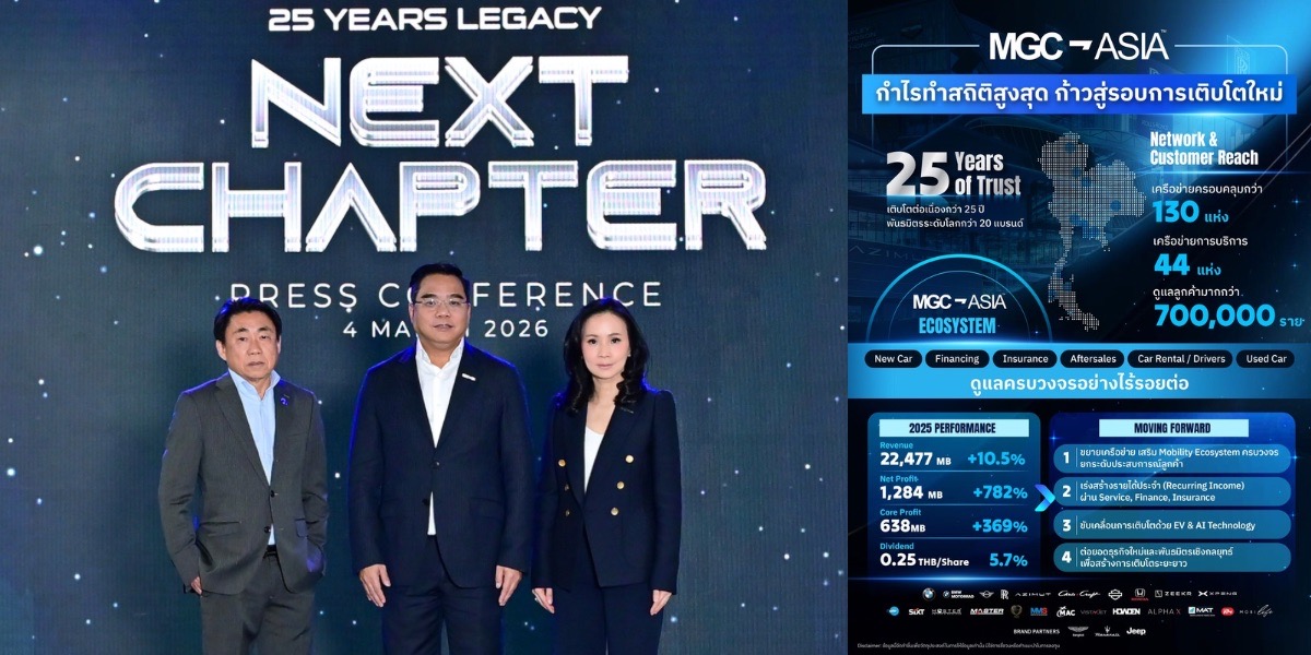 บริษัท มิลเลนเนียม กรุ๊ป คอร์ปอเรชั่น (เอเชีย) จำกัด (มหาชน) หรือ MGC แถลงผลการดำเนินงานปี 2568 เติบโตโดดเด่น พร้อมทำสถิติกำไรสูงสุดใหม่ สะท้อนความแข็งแกร่งของโครงสร้างธุรกิจในระบบนิเวศ Mobility Ecosystem ที่เชื่อมโยงตั้งแต่การจำหน่ายยานยนต์พรีเมียม รถยนต์ไฟฟ้า ธุรกิจการเงิน ประกันภัย บริการหลังการขาย และธุรกิจรถเช่า ซึ่งช่วยสร้างรายได้ประจำ (Recurring Income) เพิ่มขึ้นอย่างต่อเนื่อง