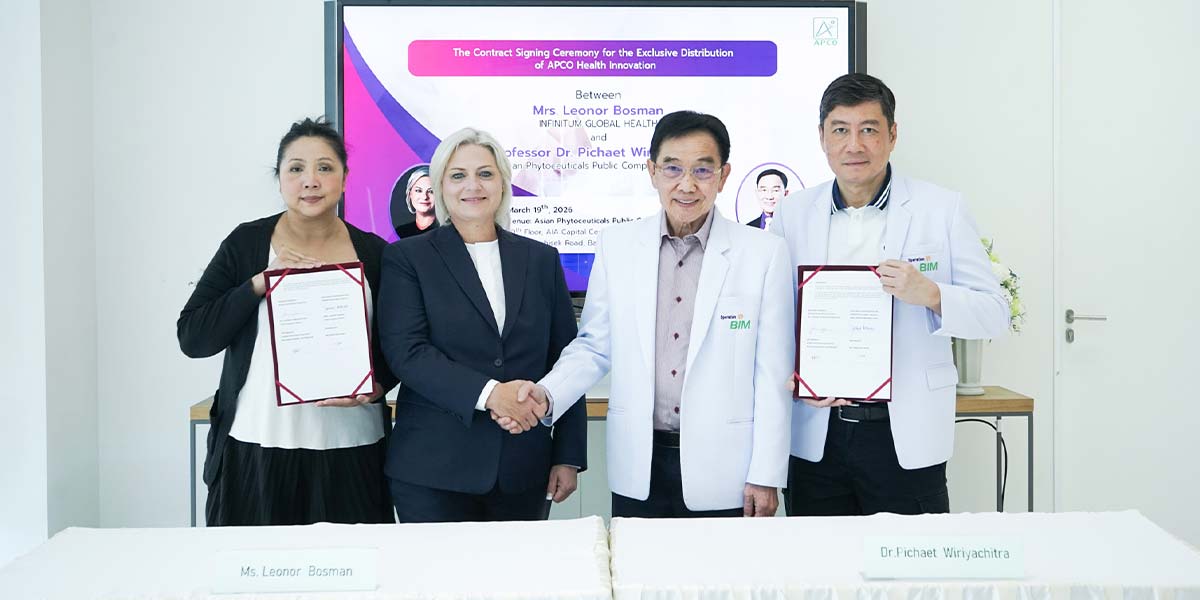 ศ.ดร.พิเชษฐ์ วิริยะจิตรา ประธานเจ้าหน้าที่บริหาร บริษัท เอเชียน ไฟย์โตซูติคอลส์ จำกัด (มหาชน) หรือ APCO เจ้าของธุรกิจนวัตกรรมธรรมชาติเพื่อสุขภาพและความงาม ด้วยการวิจัย พัฒนา ผลิตและจัดจำหน่ายครบวงจร เพื่อยกระดับคุณภาพชีวิต เปิดเผยว่า การลงนามความร่วมมือระหว่าง APCO และ Mrs. Leonor Bosman จาก INFINITUM GLOBAL HEALTH (IGH) ทำการตลาดผลิตภัณฑ์เสริมอาหารเพื่อสุขภาพในกลุ่มประเทศแอฟริกา ตะวันออกกลาง และอเมริกา