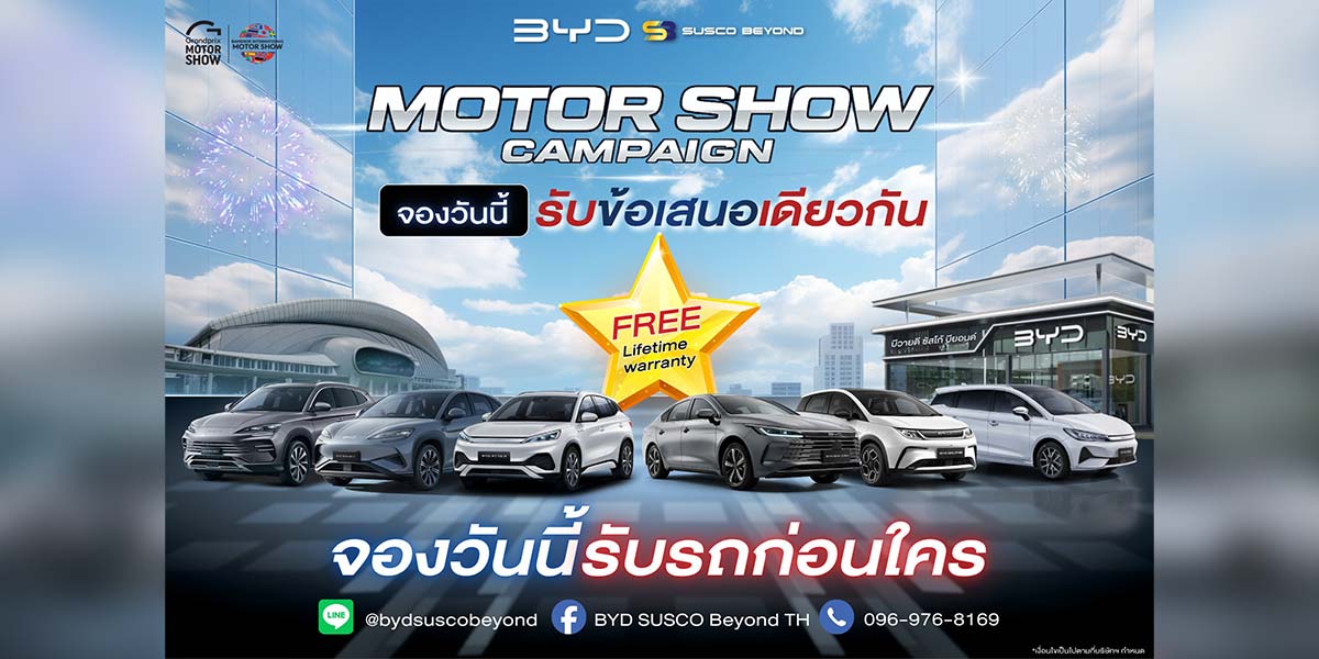 ขณะที่อุตสาหกรรมยานยนต์กำลังคึกคักรับเทศกาล Motor Show 2026 โชว์รูม BYD SUSCO Beyondไม่พลาด! จัดเต็มโปรแรง สำหรับลูกค้าที่สนใจรถยนต์ไฟฟ้า BYD หรือ DENZA เพียงจองรถ ตั้งแต่วันนี้ – 5 เม.ย. 2569 ที่โชว์รูม BYD SUSCO Beyond และโชว์รูม DENZA SUSCO Beyond Infinite ทั้ง 12 สาขา รับสิทธิพิเศษแบบจัดเต็มมากกว่า 10 รายการเทียบเท่าในงาน Motor Show แบบไม่ต้องเบียดฝูงชน…พิเศษรับฟรี Lifetime Warranty Package มูลค่า 50,000 บาท และ Home Charger ติดตั้งฟรีถึงบ้าน! สามารถติดต่อสอบถามรายละเอียดเพิ่มเติมได้ที่เบอร์ : 096-976-8169 (BYD) / 064-146-4452 (DENZA) หรือ Website : https://www.bydsuscobeyond.com/ งานนี้ไม่ใช่แค่ร่วมกระแส Motor Show แต่เป็น “หมากเกมรุก” ที่หวังชิงกำลังซื้อแบบเต็มพิกัด!