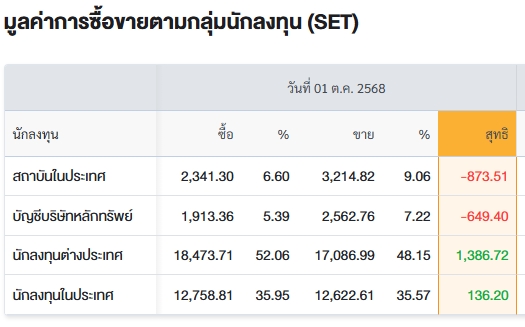 “ต่างชาติ-รายย่อย” เคาะซื้อหุ้นไทย 1.5 พันล้าน ดัน SET ปิดบวก 1 จุด สรุปการซื้อ-ขายรายกลุ่ม ประจำวันที่ 1 ต.ค.68 1 ต.ค. 2568 Share Facebook Twitter Line SET ปิดวันนี้ที่ 1,275.03 จุด เพิ่มขึ้น 0.86 จุด (+0.07%) มูลค่าการซื้อขาย 35,487.18 ล้านบาท TagsSET ตลาดหุ้นไทย ต่างชาติ รายย่อย สรุปการซื้อขายรายกลุ่ม 1 ต.ค. 2568 Share Facebook Twitter Line Share Facebook Twitter Line