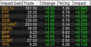นายณัฐพล คำถาเครือ ผู้ช่วยกรรมการผู้จัดการ ฝ่ายวิเคราะห์หลักทรัพย์ บล.หยวนต้า (ประเทศไทย) กล่าวว่า ตลาดหุ้นไทยเช้านี้ดัชนปรับตัวเพิ่มขึ้น ได้แรงหนุนจากการปรับขึ้นของ DELTA ที่ยังขยับขึ้นต่อ กลุ่มบริหารจัดการหนี้ BAM รวมทั้งกลุ่มส่งออกได้แรงหนุนจากค่าเงินบาทที่อ่อนค่า อย่างไรก็ตามดัชนีปรับตัวขึ้นใกล้ระดับสูงสุดเดิมที่บริเวณ 1,312 จุด อัพไซด์จำกัด และมีแรงขายออกมา แต่ภาพรวมยังยืนแดนบวกได้หลังยืนเหนือ 1,300 จุด