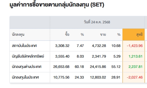 “พร็อพ-ต่างชาติ” เคาะซื้อหุ้นไทย 3.45 พันล้าน หนุน SET ปิดบวก 12 จุด สรุปการซื้อ-ขายรายกลุ่ม ประจำวันที่ 24 ต.ค.68 24 ต.ค. 2568 Share Facebook Twitter Line SET ปิดวันนี้ที่ 1,313.91 จุด เพิ่มขึ้น 11.56 จุด (+0.89%) มูลค่าซื้อขาย 44,292.69 ล้านบาท TagsSET กองทุน ตลาดหุ้นไทย พร็อพ สรุปการซื้อ-ขายรายกลุ่ม สรุปพอร์ตซื้อ-ขาย 24 ต.ค. 2568 Share Facebook Twitter Line Share Facebook Twitter Line