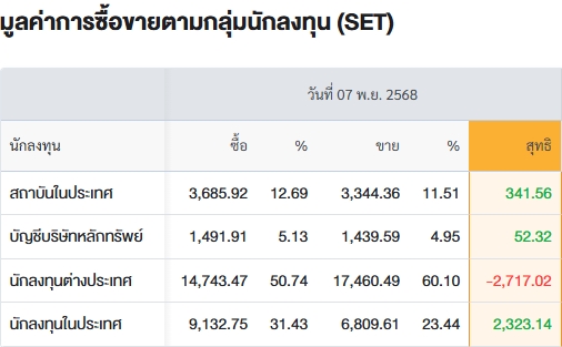 สรุปการซื้อ-ขายรายกลุ่ม ประจำวันที่ 7 พ.ย.68