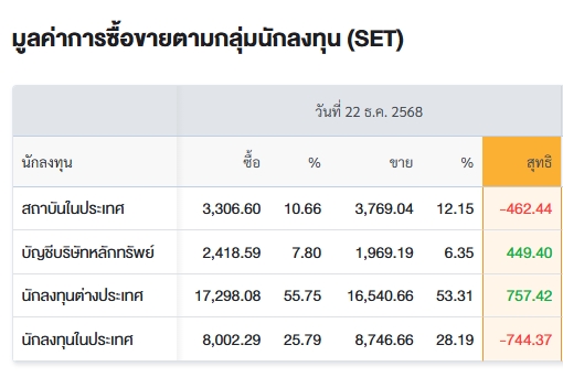 สรุปการซื้อ-ขายรายกลุ่ม ประจำวันที่ 22 ธ.ค.68