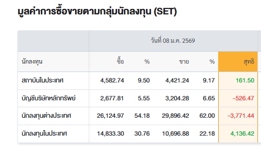 “ต่างชาติ-พร็อพ” เทขายหุ้นไทย 4.3 พันล้าน ฉุด SET ปิดลบ 27 จุด สรุปการซื้อ-ขายรายกลุ่ม ประจำวันที่ 8 ม.ค.69 8 ม.ค. 2569 Share Facebook Twitter Line SET ปิดวันนี้ที่ 1,253.60 จุด ลดลง 27.22 จุด (-2.13%) มูลค่าซื้อขาย 48,218.82 ล้านบาท TagsSET ตลาดหุ้นไทย สรุปการซื้อ-ขายรายกลุ่ม 8 ม.ค. 2569 Share Facebook Twitter Line Share Facebook Twitter Line