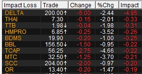 ขณะที่ตลาดหุ้นไทยมีแรงขายหุ้น DELTA กดดันดัชนี แม้จะมีแรงซื้อหุ้นในกลุ่ม ICT และท่องเที่ยว รวมทั้งแรงซื้อกลับหุ้นกลุ่ม PTT ที่วันนี้ปรับตัวขึ้นได้ดี เข้ามาช่วยพยุงให้ดัชนีดีดกลับขึ้นมาได้บ้างหลังจากลงไปลึก