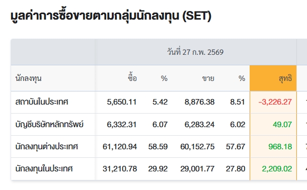 “กองทุน” เทกระจาด 3.2 พันล้าน กด SET ปิดลบ 5 จุด สรุปการซื้อ-ขายรายกลุ่ม ประจำวันที่ 27 ก.พ.69 27 ก.พ. 2569 Share Facebook Twitter Line SET ปิดวันนี้ที่ 1,528.26 จุด ลดลง 5.38 จุด (-0.35%) มูลค่าซื้อขาย 104,314.15 ล้านบาท TagsSET กองทุน ตลาดหุ้นไทย สรุปการซื้อ-ขายรายกลุ่ม 27 ก.พ. 2569 Share Facebook Twitter Line Share Facebook Twitter Line