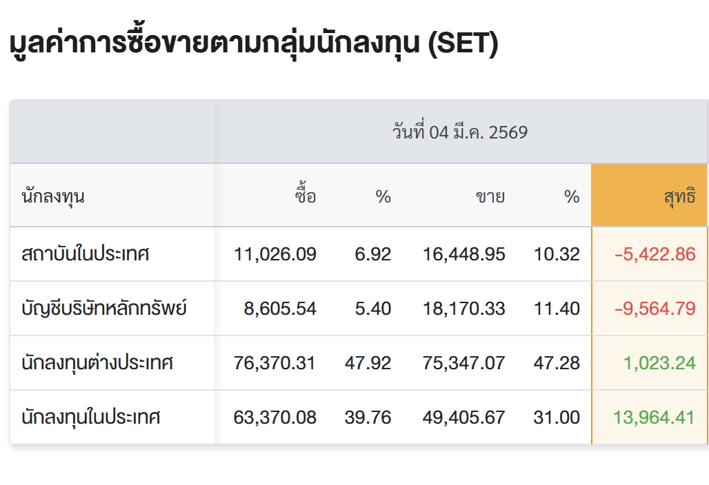 “พร็อพ-กองทุน” เทขายหุ้นไทย 1.49 หมื่นล้านบาท ฉุด SET ปิดร่วง 82 จุด สรุปการซื้อ-ขายรายกลุ่ม ประจำวันที่ 4 มี.ค.69 4 มี.ค. 2569 Share Facebook Twitter Line ดัชนีตลาดปิดวันนี้ที่ 1,384.61 จุด ลดลง 81.90 จุด (-5.58%) มูลค่าการซื้อขาย 159,372 ล้านบาท Tagsพอร์ตต่างชาติ สรุปพอร์ตซื้อขาย 4 มี.ค. 2569 Share Facebook Twitter Line Share Facebook Twitter Line