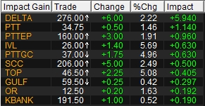 นายชาญชัย พันทาธนากิจ ผู้อำนวยการสายงานวิจัย บล.เมย์แบงก์ (ประเทศไทย) กล่าวว่า ตลาดหุ้นไทยวันนี้ปรับตัวขึ้นจากปัจจัยหนุนหุ้นกลุ่มเกี่ยวข้องกับน้ำมัน โดยเฉพาะกลุ่ม PTT ขึ้นมาค่อนข้างโดดเด่น หลังราคาน้ำมันดิบยังทรงตัวสูงต่อเนื่อง ประกอบกับ ยังไม่มีความชัดเจนของการเจรจาระหว่างสหรัฐฯและอิหร่าน ทำให้สถานการณ์ตะวันออกกลางไม่แน่นนอนเป็นปัจจัยหนุนราคาน้ำมัน ซึ่งหุ้นกลุ่มน้ำมัน โรงกลั่น และปิโตรเคมี ยังได้รับอานิสงส์ ขณะเดียวกัน ยังมีแรงซื้อ DELTA เข้ามาหนุนดัชนีราว 5 จุด