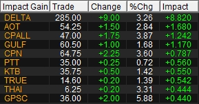 อย่างไรก็ตาม ยังคงมีแรงขายทำกำไรสลับออกมาในหุ้นกลุ่มน้ำมันและกลุ่มปิโตรเคมี เนื่องจากราคาน้ำมันดิบในตลาดโลกปรับตัวลดลงอย่างรุนแรง ซึ่งปัจจัยดังกล่าวได้กดดันให้ดัชนีตลาดหุ้นไทยไม่ได้ปรับตัวเพิ่มขึ้นมากเท่ากับตลาดหุ้นอื่นในภูมิภาคเอเชีย ประกอบกับในช่วงที่ผ่านมา ตลาดหุ้นไทยปรับตัวลดลงน้อยกว่าตลาดหุ้นต่างประเทศ จึงทำให้ภาพรวมการฟื้นตัวในวันนี้ปรับขึ้นในสัดส่วนที่น้อยกว่าเมื่อเทียบกับตลาดเพื่อนบ้าน