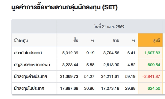 สรุปการซื้อ-ขายรายกลุ่ม ประจำวันที่ 21 เม.ย.69