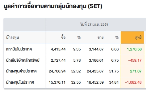 “กองทุน-ต่างชาติ” เคาะขวา 1.54 พันล้าน ดัน SET ปิดบวก 23 จุด สรุปการซื้อ-ขายรายกลุ่ม ประจำวันที่ 27 เม.ย.69 27 เม.ย. 2569 Share Facebook Twitter Line ตลาดหุ้นไทยปิดวันนี้ที่ 1,479.13 จุด เพิ่มขึ้น 23.03 จุด (+1.58%) มูลค่าซื้อขาย 47,219.93 ล้านบาท Tagsสรุปการซื้อ-ขายรายกลุ่ม สรุปพอร์ต 27 เม.ย. 2569 Share Facebook Twitter Line Share Facebook Twitter Line