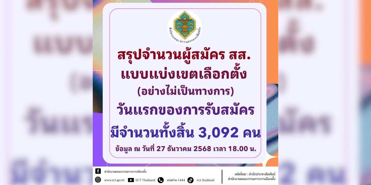 “กกต.” สรุปยอดสมัคร ส.ส.แบ่งเขตทั่วประเทศวันแรก 3,092 คน จาก 77 จังหวัด “กทม.” ยอดมากสุด 449 คน รองลงมา “นครราชสีมา” 120 คน สะท้อนบรรยากาศเลือกตั้ง 2569 ที่เริ่มร้อนแรงและคึกคักตั้…