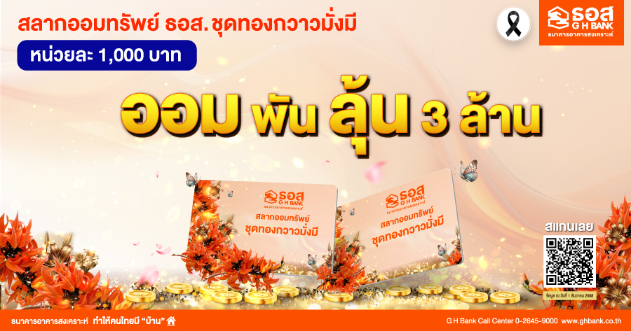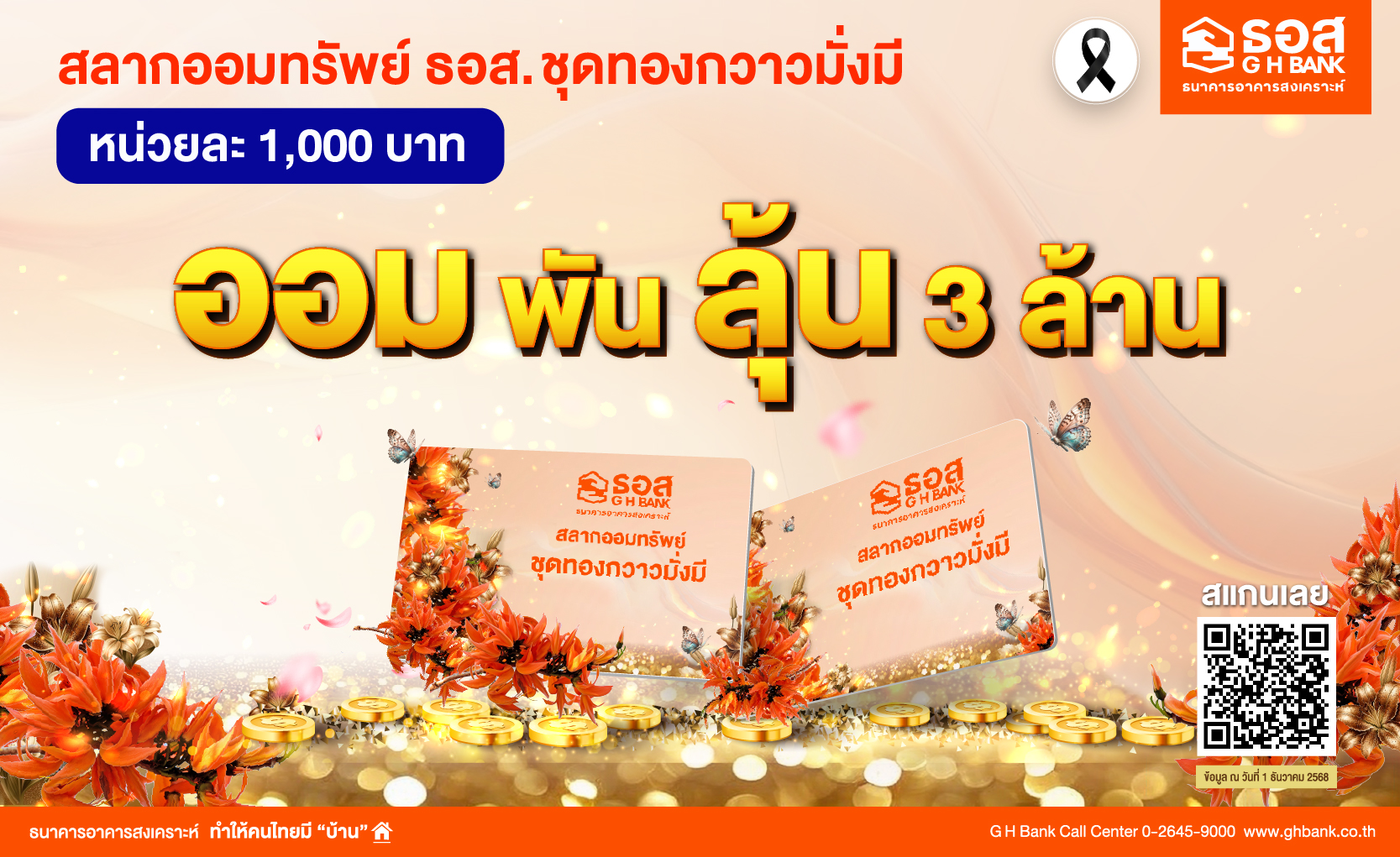 “ธอส.” เปิดจำหน่ายสลากออมทรัพย์ชุดทองกวาวมั่งมี หน่วยละ 1,000 บาท พร้อมลุ้นรางวัลทุกเดือน 12 งวดต่อปี ผลตอบแทนรวมขั้นต่ำ 0.50% ต่อปี และลุ้นรับรางวัลใหญ่มูลค่าสูงสุด 3 ล้านบาท